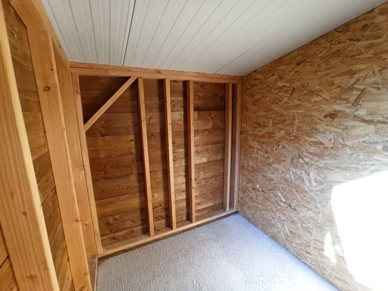 Cet abri est séparé en deux par une paroi à l’intérieur dans le but de sécuriser le stockage de la partie gauche avec une serrure installée sur la porte coulissante. Nos clients souhaitaient laisser ouvert la partie à droite afin d’y mettre les poubelles et quelques objets aillant peu de valeur sur des étagères.