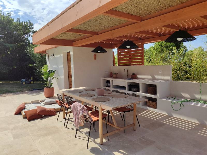 Vous découvrirez ici, en bas de page, plusieurs photos, de l'une de nos réalisations, c'est une construction englobant une splendide pergola avec cuisine d'été et une plage de piscine en bois exotiques.