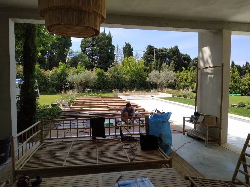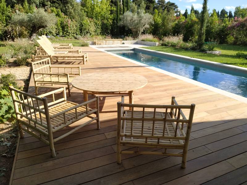 Ici notre client à Châteaurenard avait le désir d'installer cette nouvelle terrasse en bois, afin de profiter de sa piscine sur toute sa longueur pour y placer ses chaises longues en bambou, recevoir ses amis, sa famille de la plus belle des façons, merci beaucoup pour la confiance qu'il nous a accordée. Pour info, une terrasse en bois posée autour d'une piscine est aussi appelée "plage de piscine".